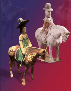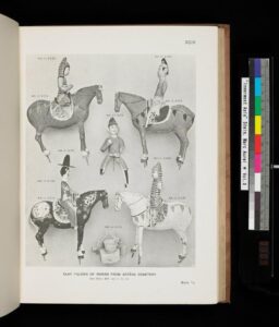1915-يىلى ئەنگلىيەلىك ئارخېئولوگ مارك ئاۋرېل ستەيىن (Aurel Stein) نىڭ ئېكسپېدىتسىيە ئەترىتى تۇرپان ئويمانلىقىدىن 180 ساندۇققا يېقىن مەدەنىيەت بۇيۇملىرىنى قېزىۋالغان ۋە بۇلارنىڭ بىر قىسمىنى بۈيۈك بىرىتانىيە مۇزىيېغا ئىئانە قىلغان. ھازىر لوندونغا جايلاشقان بۈيۈك بىرىتانىيە مۇزېيى سىتەيىن كوللېكسىيونىدا تۇرپاندىن ئېلىپ كېلىنگەن ئات مىنگەن ئايال، ئات مىنگەن ئەر كىشى، تۆگە، سېرىكچى، چەۋگەن توپ ئويناۋاتقان كىشى قاتارلىقلارنىڭ ئوبرازى يارىتىلغان ھەيكەللەر ساقلانماقتا. ئاۋرېل سىتەيىن ئۆزىنىڭ ئوتتۇرا ئاسىيا ھاسىلاتلىرى ھەققىدە تەپسىلىي ئىلمىي دوكلاتلارنى قالدۇرغان بولۇپ، ئۇنىڭ «ئات مىنگەن ئايال» ھەيكىلى توغرىسىدا «ئىچكى ئاسىيا» ۋە «سېرىدىيا» قاتارلىق كىتابلاردىكى چۈشەندۈرۈشلىرىنى تۆۋەندىكى قۇرلارغا يىغىنچاقلاشقا بولىدۇ: «قەبرىلەردىن تاڭ سۇلالىسى ئۇسلۇبىدا ياسالغان بېشى كىچىكرەك، بوينى ئۇزۇن كەلگەن ئاتلارنىڭ ھەيكەللىرى ۋە ئۇنىڭغا ماس كەلگەن تاڭ ئۇسلۇبىدىكى ئۇچلۇق ئېگەرلەر تەسۋىرلەنگەن ھەيكەللەر بايقالدى. يەنە ئوخشاش بىر قەبرىدىن پامىر تاغلىرى ئېتىكىدە داڭ چىقارغان بەدەخشان ئاتلىرىغا ئوخشايدىغان ئات ھەيكەللىرىنىمۇ قېزىۋالدۇق. بۇ تۈردىكى ھەيكەللەردە گەۋدىلەنگەن ئات ئېگەرلىرى ناھايىتى كۆركەم بولۇپ، نەقىشلىرى ئەينەن تۈركىستاندىكى كىگىز سېلىنچىلارنىڭ نۇسخىلىرىغا ئوخشايتتى، ئاتنىڭ يايلىرىمۇ بەئەينى خوتەن دەندان ئۆيلۈك قەدىمىي خارابىسىدىن تېپىلغان ئات ھەيكەللىرىگە ئوخشايتتى. ئات مىنگەن كىشىلەر تېمىسىدىكى ھەيكەللەر تۈرلۈك بولۇپ، بىر قىسمى بېشىغا دۇبۇلغا، ئۇچىسىغا تار پۇشقاقلىق ئىشتان كىيگەن ئورا كۆزلۈك ئەر چەۋەنداز ھەيكىلى بولسا، يەنە بىر قىسمى مىڭ ئۆي غار رەسىملىرىدىكى ساخاۋەتچىلەرنىڭ ئوبرازىغا ئوخشايدىغان بۇددىستچە كىيىنگەن كىشىلەر، يەنە بەزىلىرى بولسا يۈزىگە خىتايچە سەنئەت ئۇسلۇبى بويىچە بوياق بېرىلگەن، بېشىغا ئۇچلۇق كەلگەن شىلەپە كىيىۋالغان ئات مىنگەن ئايال ھەيكەللىرى ئىدى.»
