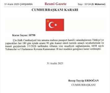31- دېكابىر تۈركىيە «رەسمىي گېزىت»تە ئېلان قىلىنغان، تۈركىيە جۇمھۇرىيىتى رەئىسى رەجەپ تايىپ ئەردوغاننىڭ ئىمزاسى بولغان 10798- نومۇرلۇق قارارنامىدە: «6458- نومۇرلۇق كۆچمەنلەر ۋە خەلىقئارالىق قوغداش قانۇنىنىڭ 18- ماددىسىغا ئاساسەن، 2026- يىلى 2- يانۋاردىن باشلاپ، جۇڭخۇا خەلىق جۇمھۇرىيىتى پۇقرالىرىنىڭ نورمال پاسپورت بىلەن تۈركىيەدە ھەر 180 كۈن ئىچىدە ئەڭ كۆپ بولغاندا 90 كۈن تۇرۇشى، ساياھەت قىلىشى ۋە توختاپ ئۆتۈشى ئۈچۈن ۋىزا تەلەپ قىلىنمايدۇ» دېيىلگەن. ئۇنىڭدىن بۇرۇن خىتاي پۇقرالىرى تۈركىيەگە بېرىش ئۈچۈن ئېلىكترونلۇق ۋىزا ئېلىشى كېرەك بولۇپ، بۇ خىل ۋىزا بىلەن تۈركىيەدە ئەڭ ئۇزۇن بولغاندا 30 كۈن تۇرغىلى بولاتتى.